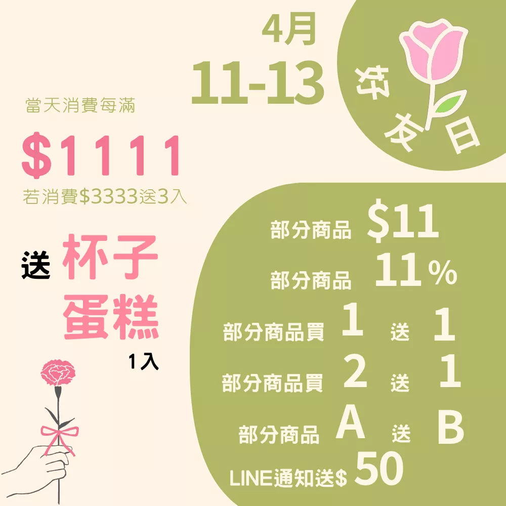 ・每滿$1111送1入杯子蛋糕(滿$3333送3入)