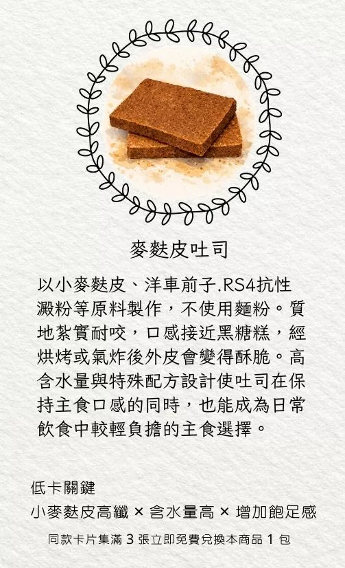 麥麩皮吐司屬無澱粉吐司.麵包大部分為取代性主食,主食材為水.麥麩皮(小麥的外皮).磷酸二澱粉.赤藻糖醇.洋車前子,因水分含量大加上原型食材熱量低容易飽足,富含水溶性膳食纖維與非水溶性膳食纖維,建議食用產品一天不超過200公克。建議依照喜歡的口感.預算.便利性多元選擇不同類型產品成為日常不可或缺的主食,建議使用氣炸鍋.烤箱.平底鍋.鐵板加熱會顯出麥麩皮的香氣與酥脆,此款產品適合生酮飲食.嚴格計算碳水化合物者,但一般人.老人.孕婦皆可食用,幼兒或孩童只能少量攝取,麥麩皮系列產品幾乎可直接攜帶出門食用方便。