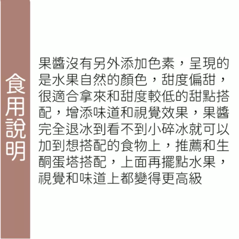果醬在冷凍狀態下,有著類似軟糖的Q度,完全退冰後,質地濃稠,甜味十足帶著水果清香,適合與無糖優格或吐司搭配。