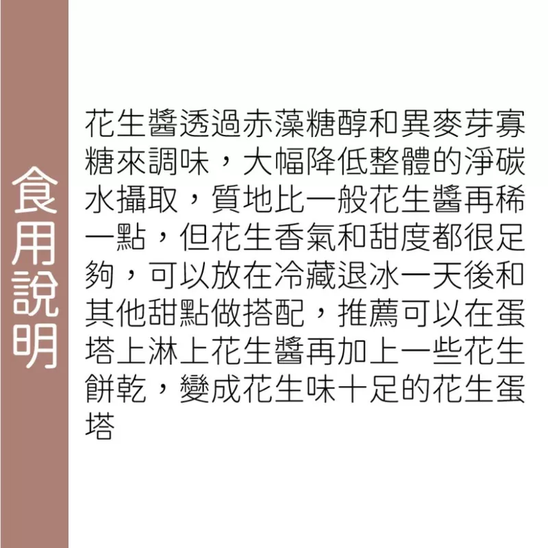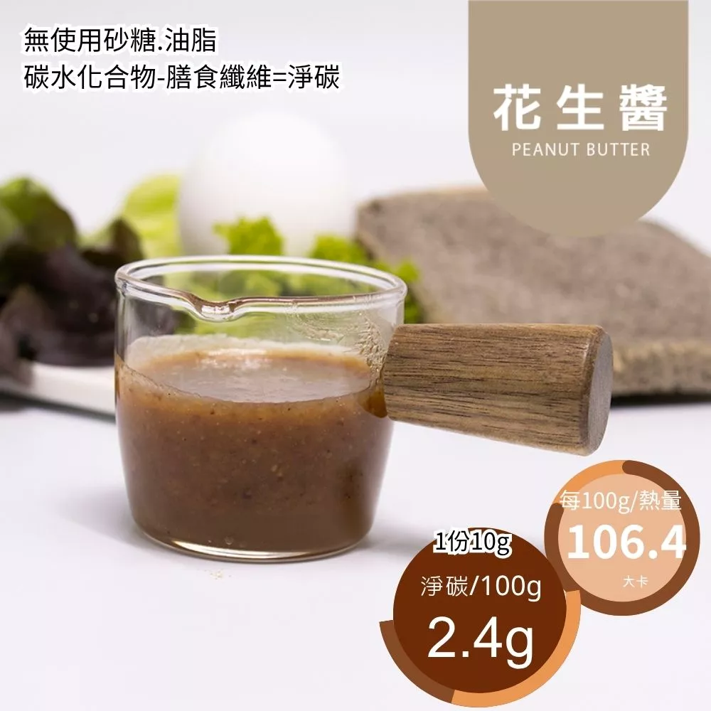 1.花生醬主要由花生、赤藻糖醇、異麥芽寡糖等食材製成,每 100g 僅含 9g 的脂肪,熱量大幅降低。
