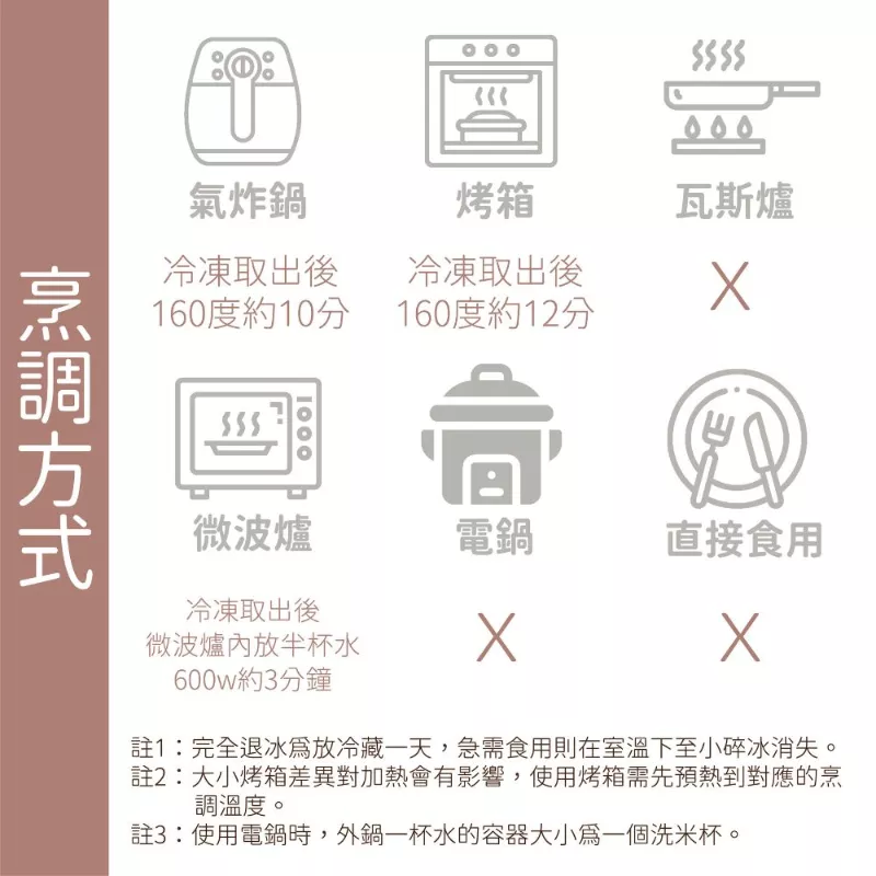可使用氣炸鍋、烤箱、微波爐加熱。