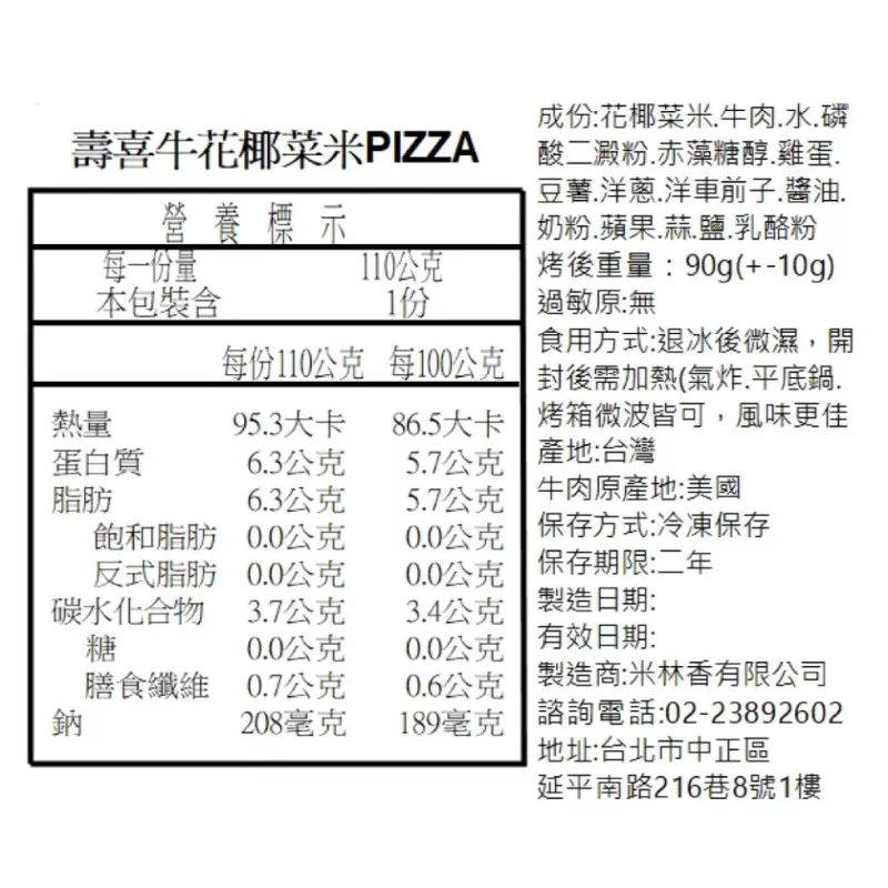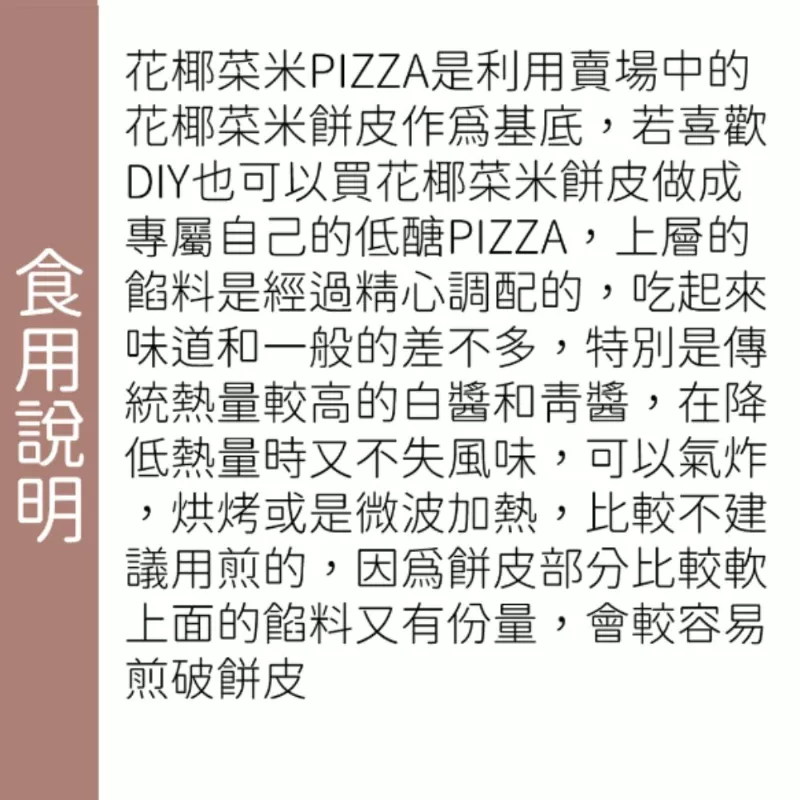 1.花椰菜米披薩主要以花椰菜米、乳酪、磷酸二澱粉、赤藻糖醇、洋車前子、雞肉、九層塔等食材製成,使用低卡花椰菜米餅皮作基底,熱量大幅降低。