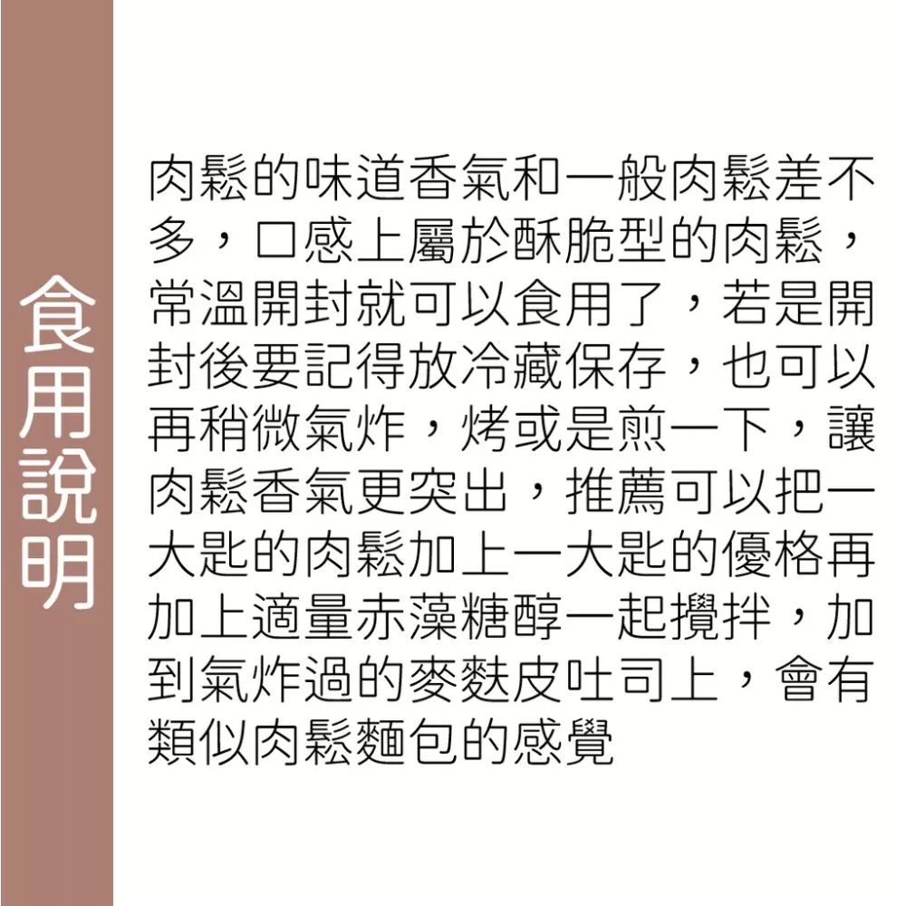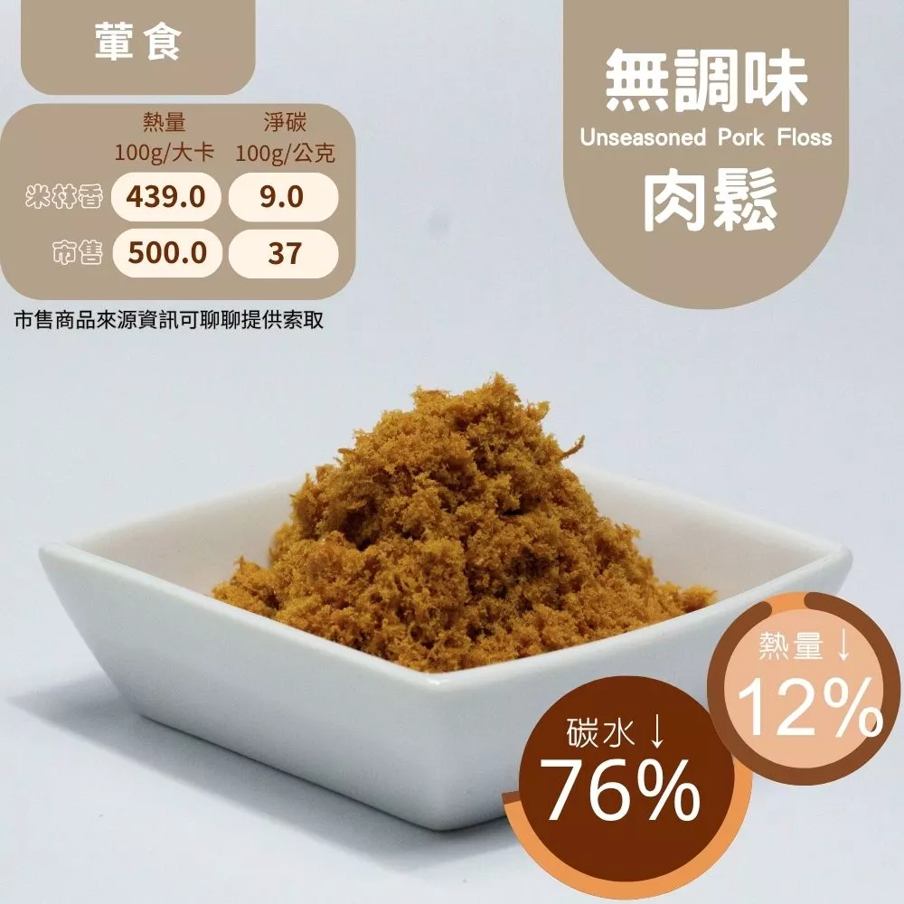僅使用豬後腿肉與黃豆粉,無油無糖無鹽,保有肉鬆自然香氣與鬆鬆口感,清爽無負擔。