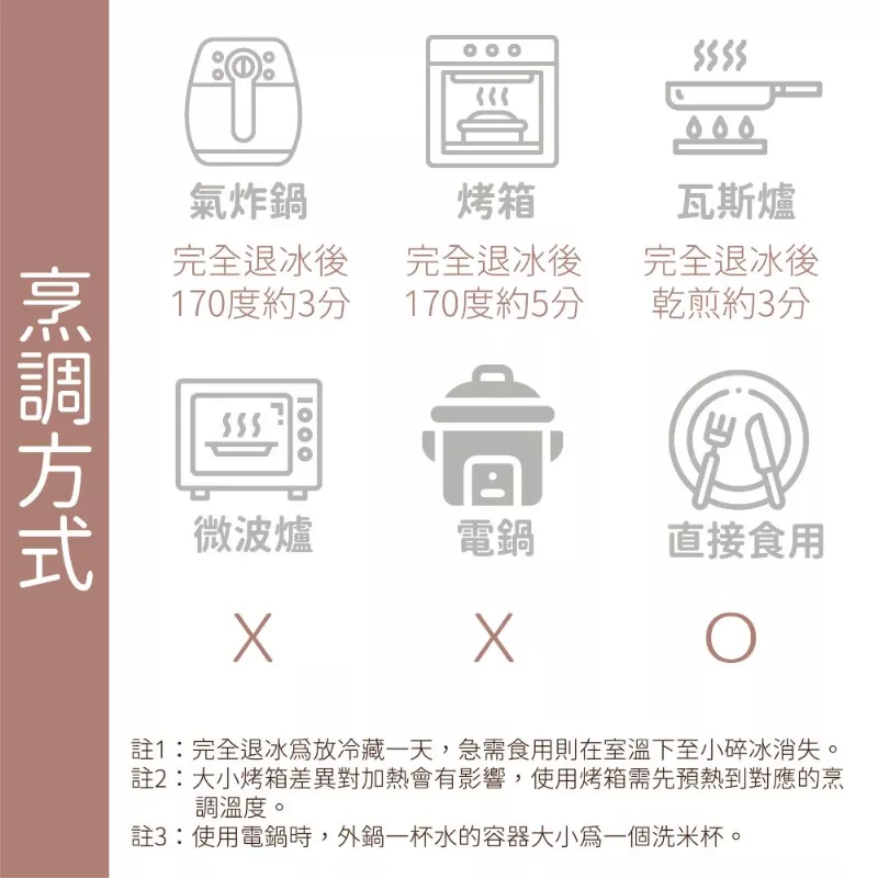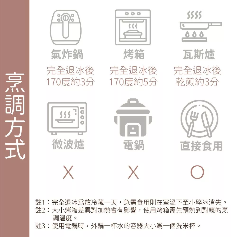 可使用氣炸鍋、烤箱、瓦斯爐加熱或直接食用。