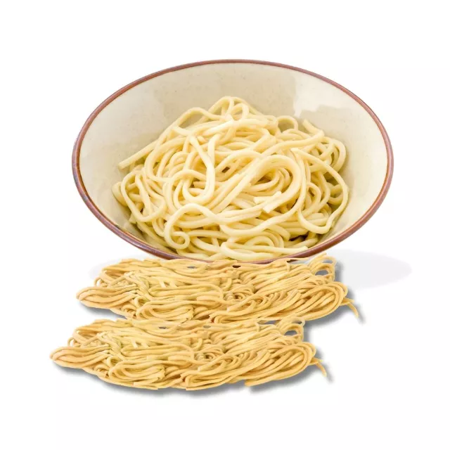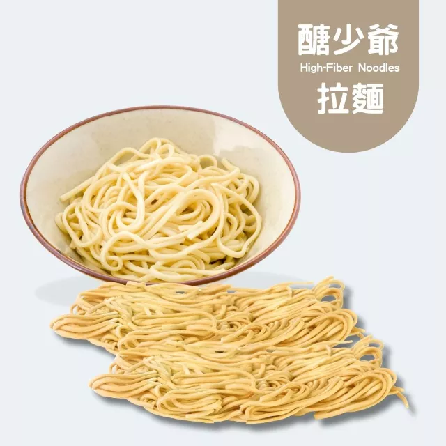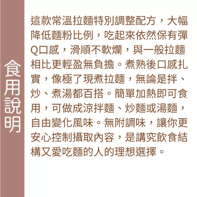 以膳食纖維取代25%麵粉,不含砂糖與油脂,保有拉麵該有的Q彈筋性,卻更清爽無負擔。煮熟後口感扎實,不易糊爛,咀嚼感類似白飯般飽滿實在,不論乾拌、煮湯、快炒都能輕鬆駕馭。