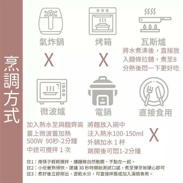 微波爐:麵條放入碗中,加入熱水至齊高,蓋上微波蓋,加熱90秒~2分鐘,中途攪拌1次