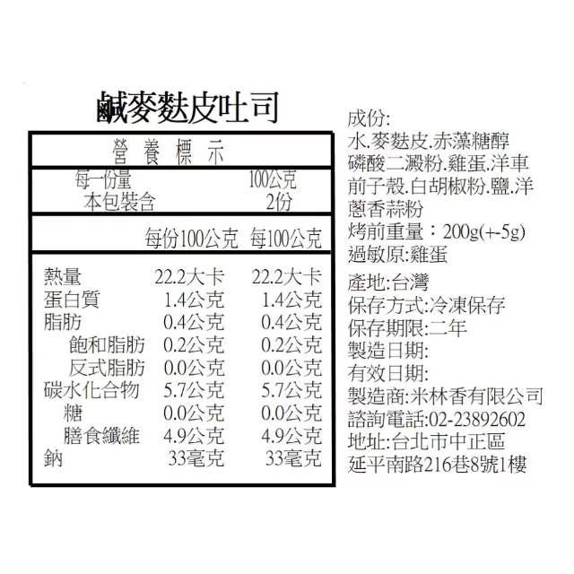 1.由麥麩皮、赤藻糖醇、洋車前子殼、雞蛋及磷酸二澱粉等成分製成,此款為無麵粉吐司,熱量大幅降低。